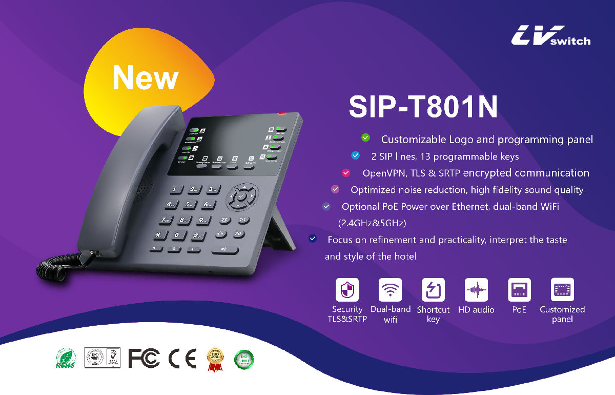 The T801N Series Hotel Phone is a high-end IP phone designed specifically for the hotel industry, focusing on improving the guest stay experience and optimizing hotel communication management. With its innovative design and powerful features, the T801N series provides hotels with convenient and efficient communication solutions to meet the needs of modern hotel management.